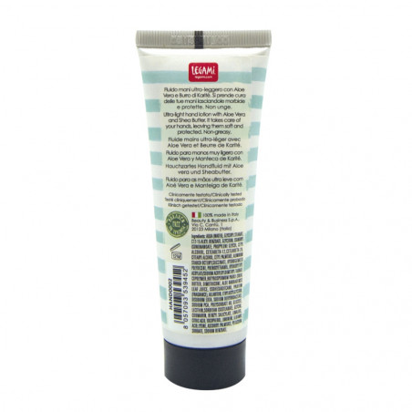 Ultra lahka krema Legami za roke z aloe vero in shea maslom, velikost 12 x 4,5 cm, vsebuje 50 ml kreme.